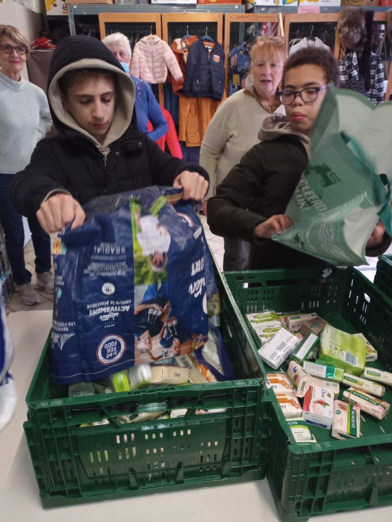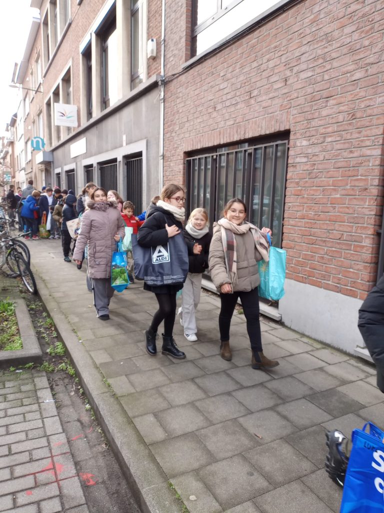 À l’occasion de la fête de Noël, notre école a organisé une grande récolte d’aliments non périssables.Munis de sacs bien remplis, les élèves des quatre classes de 5P et 6P sont allés porter le tout à l’association Saint-Vincent-de-Paul.Les dons seront redistribués, la demande étant importante.Ce fut un beau moment de partage de Noël.